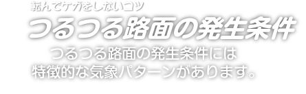 また札幌では、真冬はあまり気温が0℃以上になることはありませんが、気温がプラスになった日の夜や翌日に気温が一気に冷え込むと、溶けた水が市内の各所でいっせいに凍結し、市内中がつるつる路面になることがあります。 よく日光の当たる場所の雪が昼間に少し融けて、夕方太陽が沈むとともに冷えてつるつる路面になる場合もあります。 また、交差点付近がつるつる路面になるのは、停車している自動車からの熱が雪の表面を融かすことが関係しています。
